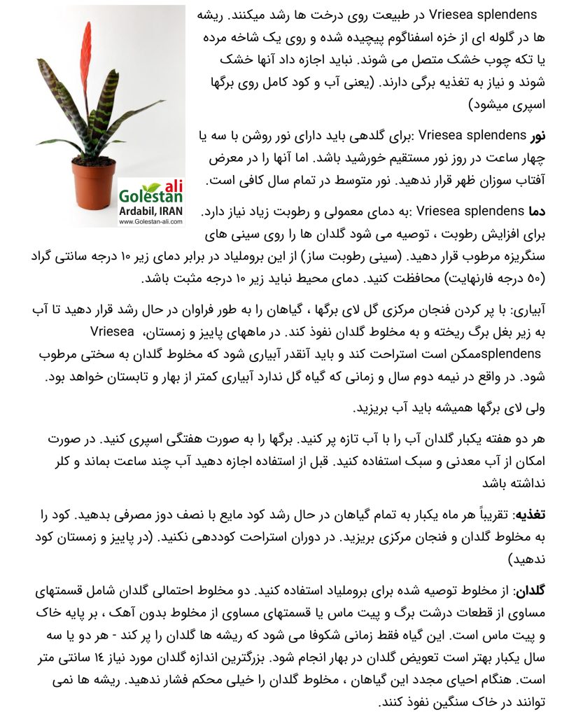 مشخصات: اسم علمی این گیاه Vriesea splendens ، از خانواده Bromeliaceae میباشد. این جنس دارای 190 گونه، از گیاهان چندساله گلخانه ای زینتی است گل آذین گونه های مختلف ، گوناگون با حالت های مورب یا افقی می باشد. به طور كلی گونه هایی كه دارای گلهای زرد هستند، در روز به گل می روند وآن هایی كه گلهای سفید دارند، در شب گل می دهند گونه مذكور، بومی گینه است و ارتفاع آن به حدود 45 سانتی متر می رسد. گیاه وریزیا حالت روزت دارد و شامل برگهای سبز تیره با لكه ای عرضی ارغوانی تیره می باشد. گلهای این گیاه شمشیر مانند بوده و دم گلی در حدود 60 سانتی متر دارد كه نصف آن شامل گل آذین سنبله با براكته های قرمز و گلهای زرد است. گلها در اواخر تابستان ظاهر می شوند.